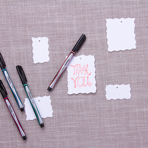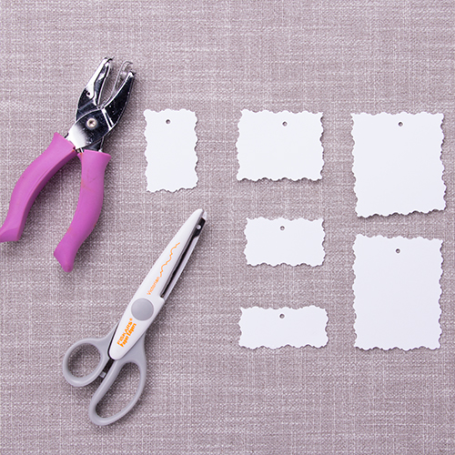Using the crafting scissors, cut the card stock in squares, rectangles, or circles. If you'd like to leave a thoughtful note we suggest practicing before you cut so you'll know how much space is needed.